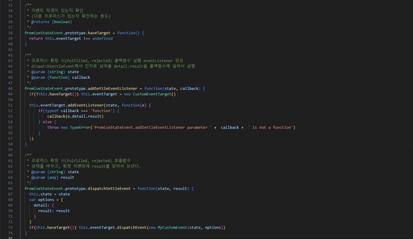 - PromiseStateEvent는 CustomPromise에 상속할 객체로 프로미스 상태와 EventTarget을 관리하는 역할을 합니다.