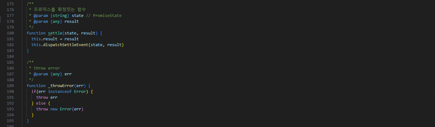 - settle은 프로미스 확정함수로 결과값을 저장하고, 상태저장과 이벤트를 보내는 dispatchSettleEvent에 상태와 결과값을 담아서 호출합니다.